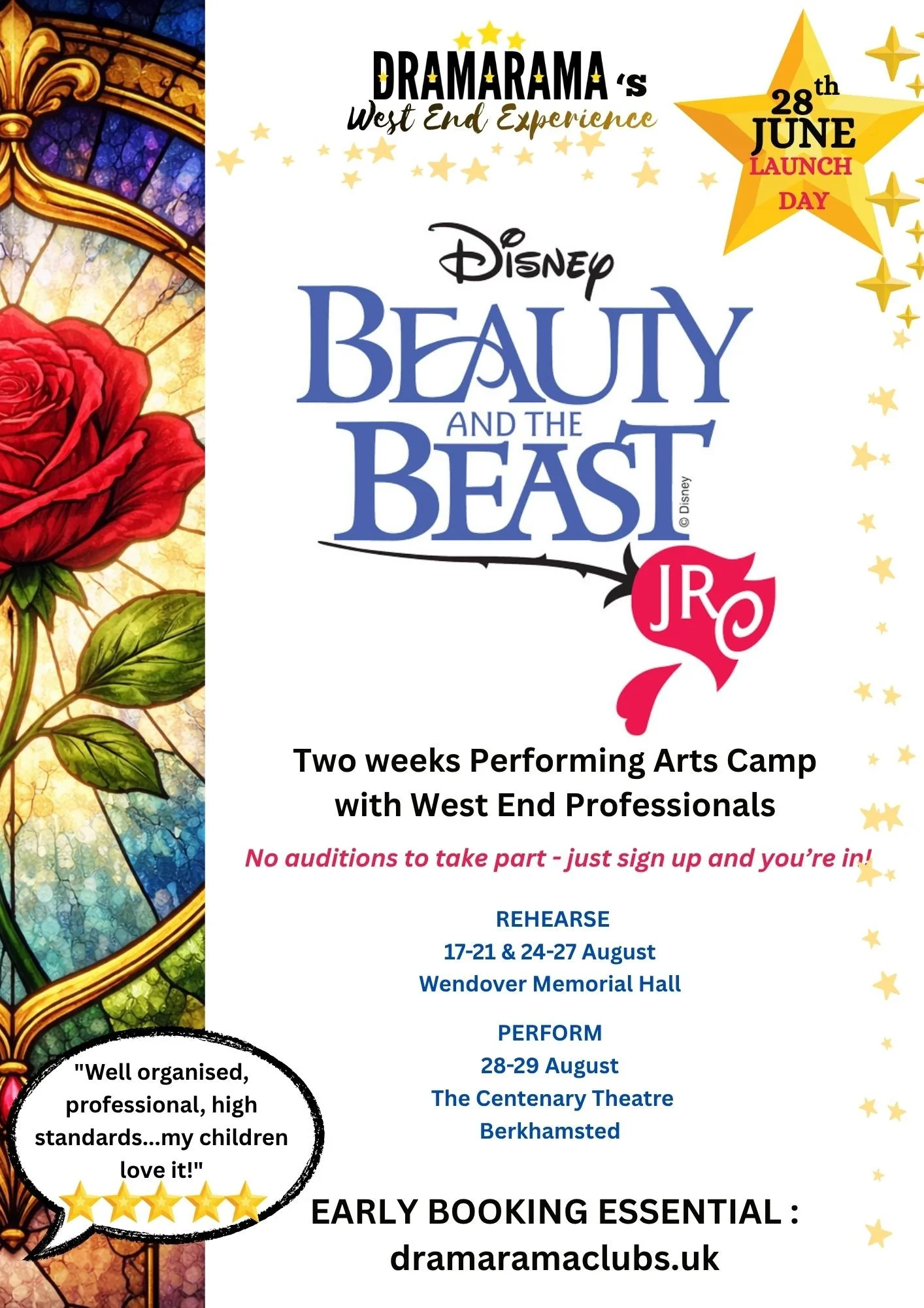 Come and be a part of our magical production of Beauty and the Beast Jr! Perform on a stunning professional stage, wear professional costumes and be suspported by a wonderful team who are commited to ensuring EVERY child or teen taking part has the BEST time! Must book by 31st May 2026!